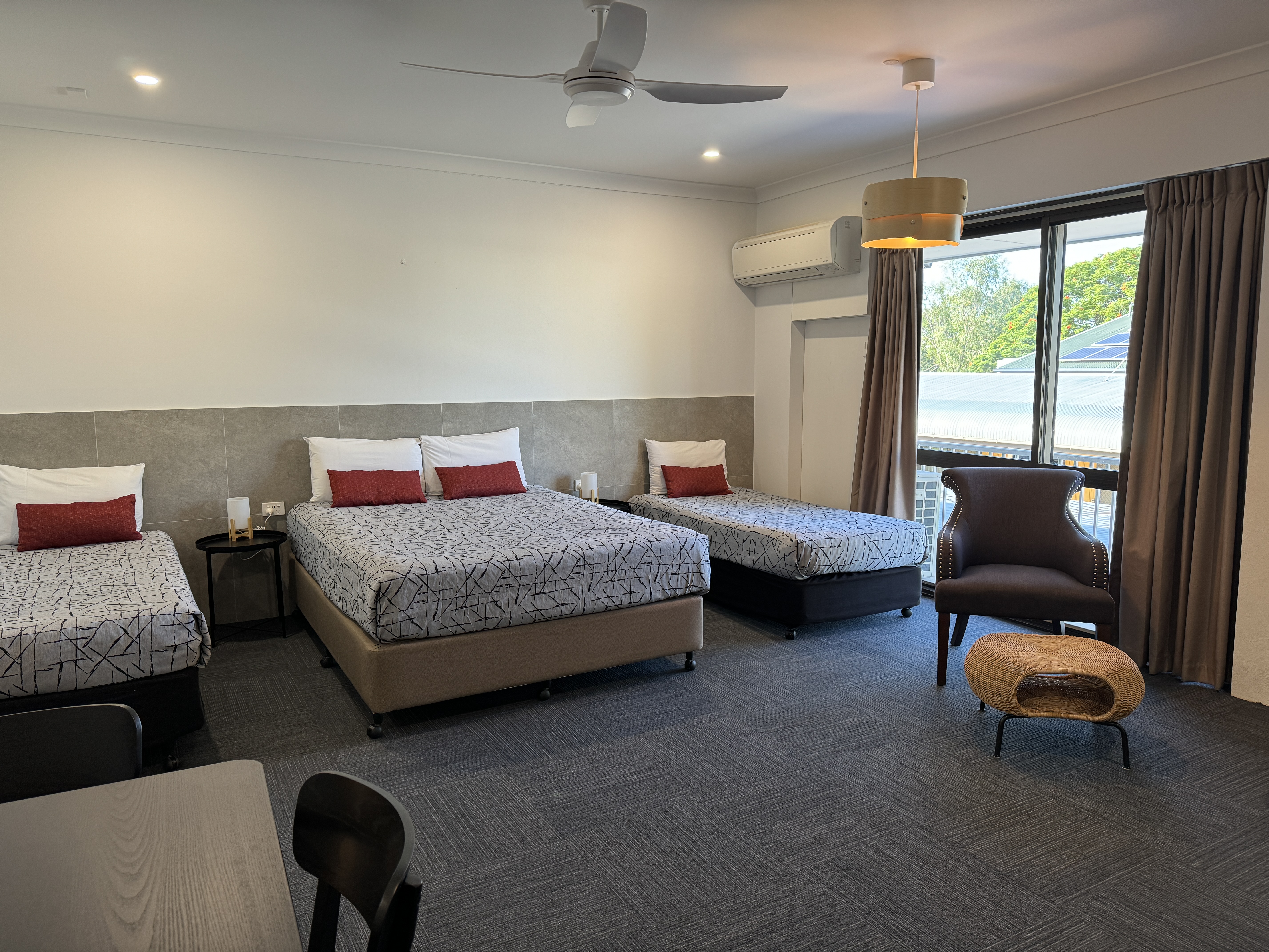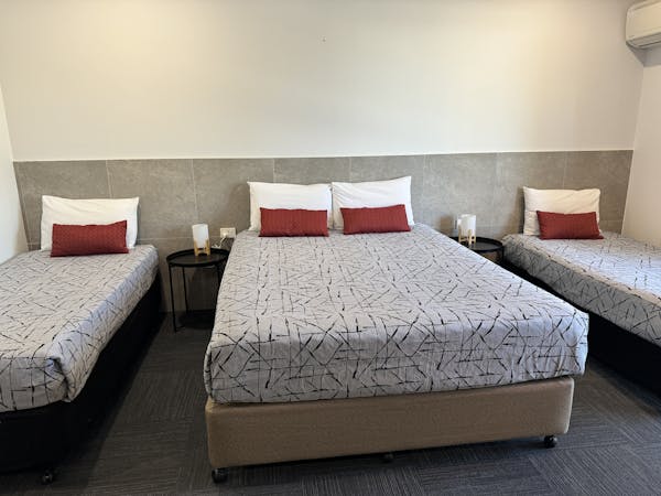 Our open plan Family Rooms are located on two levels. Upstairs rooms have a balcony. All rooms include new 5 star Queen beds and configurations vary to include either two or three single beds. This room has a Queen bed + 2 King Single beds.