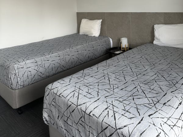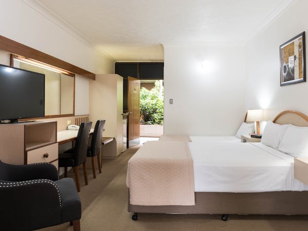 2 bedroom Family Suite comprises of a Queen Bed and 3 King Single Beds in two adjoining rooms. Each room comes with its own Smart TV and air conditioner.